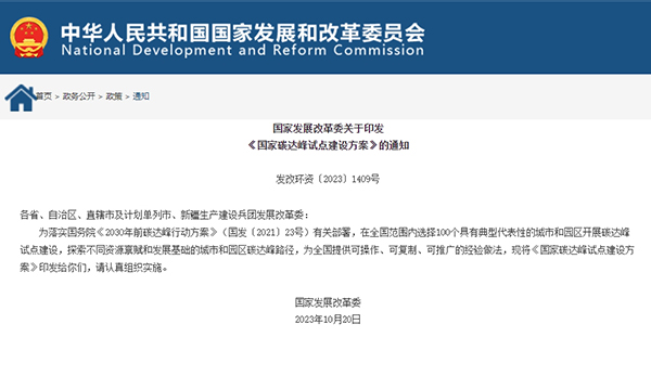 11月6日,国家发展改革委印发《国家碳达峰试点建设方案》的通知(发改环资〔2023〕1409号),在全国范围内选择100个具有典型代表性的城市和园区开展碳达峰试点建设,探索不同资源禀赋和发展基础的城市和园区碳达峰路径,为全国提供可操作、可复制、可推广的经验做法。