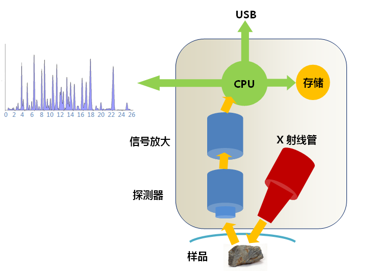 分析仪由如下光学技术平台构成,该技术平台由X射线管、真空仓、探测器等光学组件构成。X射线管发出的光直接照射在待测样品,激发待测物质中的原子,使之产生荧光,被探测器接收。